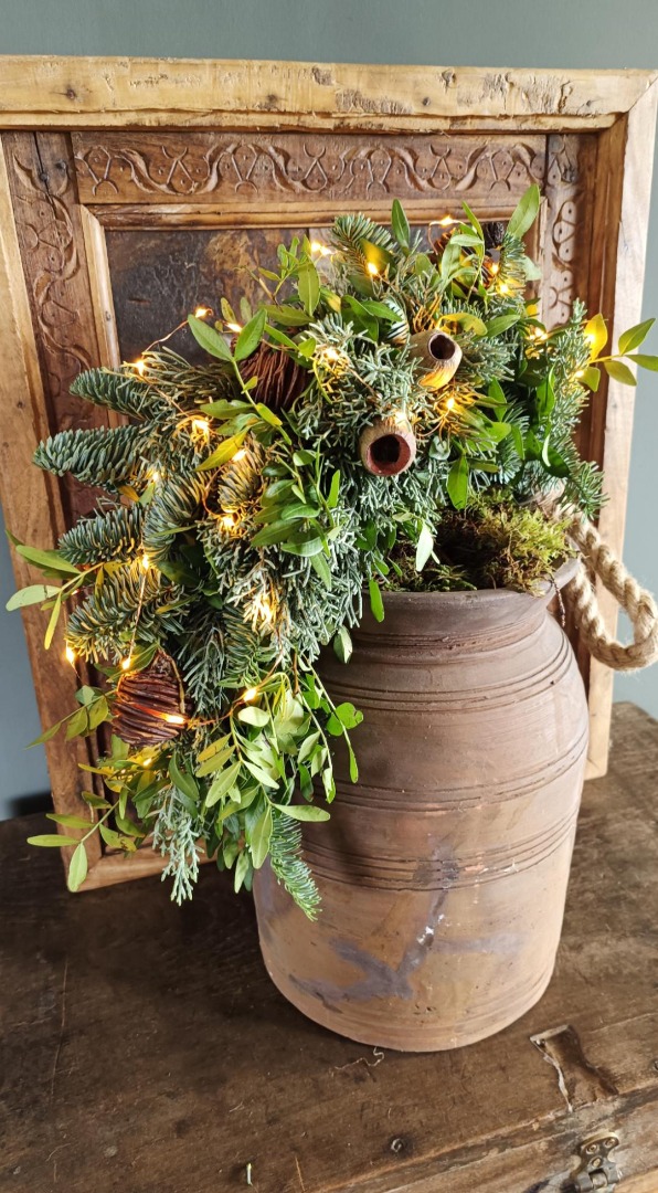 Inhoud pakket: beschrijving, touw, wikkeldraad, groen- en decoratiematerialen, verlichting en batterijen.